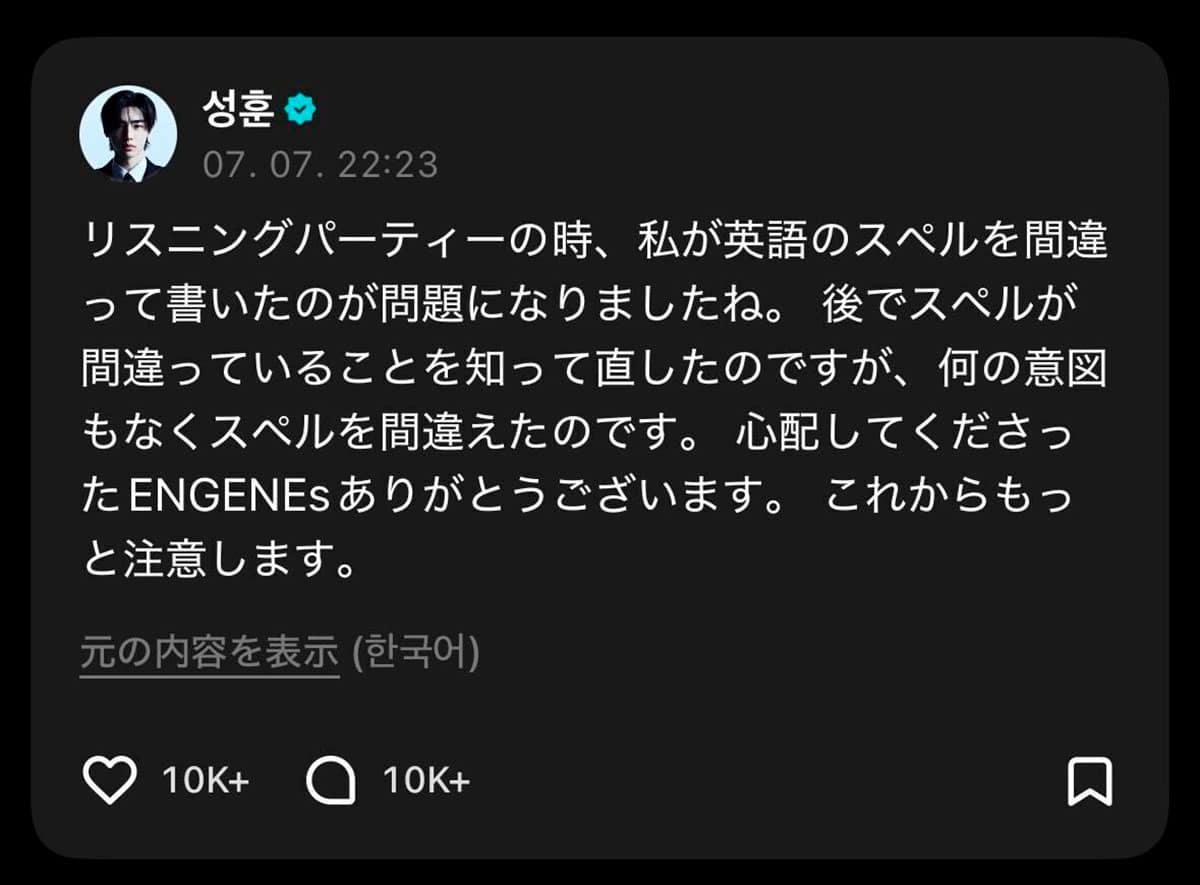 炎上を受けて、ソンフンは7月7日のXで、自身の発言に関して、《リスニングパーティーの時、私が英語のスペルを間違えて書いたのが