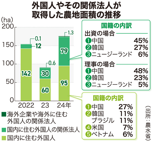 2025年9月17日 農水省は16日、外国人やその関係法人が2024年に取得した日本国内の農地面積が175・3ヘクタールに上り、比較可能な22年以降で過去最多だったと発表した。日本に住む外国人が営農目的で取得するケースが多かった。今回、個人や法人など取得者の形態ごとに国籍の内訳を初めて公表したが、いずれも中国が最多だった。