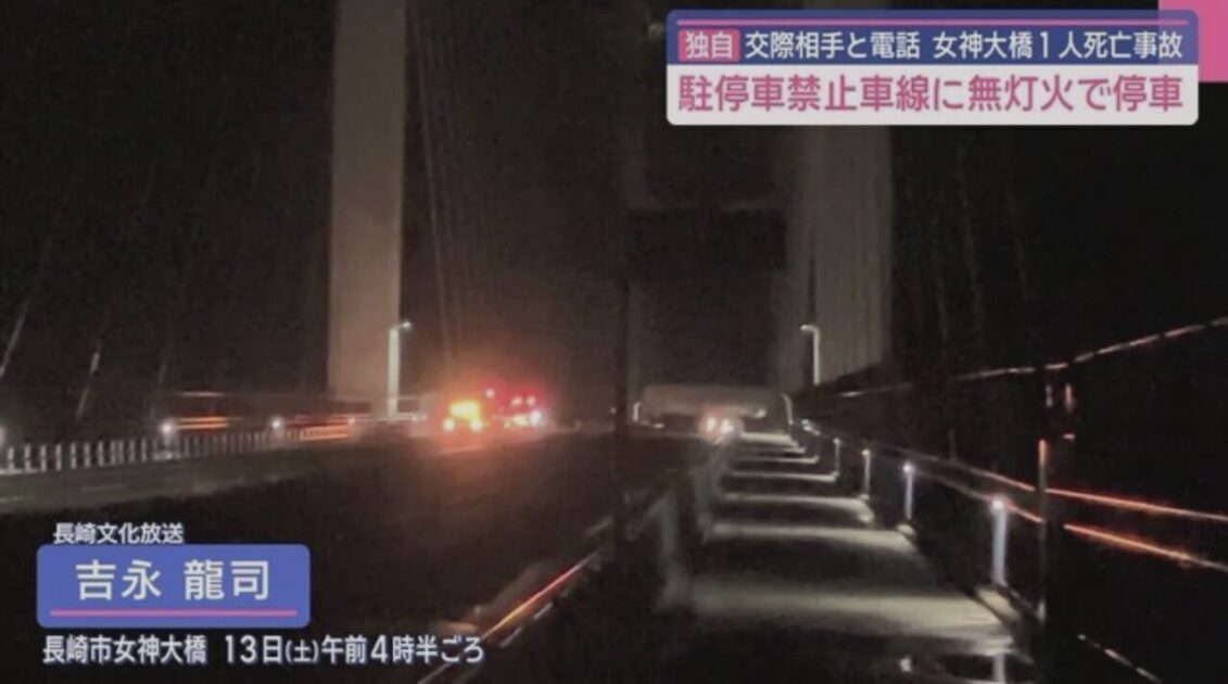 NCC長崎文化放送13日、長崎市の女神大橋で大型トレーラーが乗用車に追突し、トレーラーの運転手が死亡した事故の続報です。追突された乗用車は、駐停車禁止の車線にライトを消して止まっていて、運転手は、交際相手と電話をしていたことが関係者への取材で分かりました。