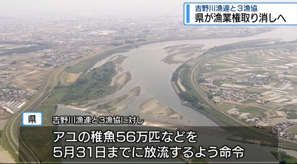 2025年9月16日 18:43吉野川の漁業権を共同で所有する漁連と漁協が、漁業法で義務付けられた稚魚の放流を怠ったうえ、県の命令にも従わなかったとして、県は漁業権の取り消しに向けた手続きを始めました。