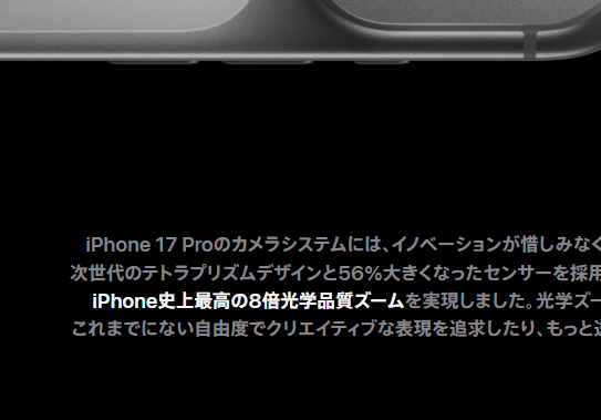 9月19日午後6時30分時点で、表記が変わっていることを編集部が確認した。iPhone 17 Proが搭載するカメラシステムについての解説文も、「iPhone史上最高の8倍光学品質ズーム」と表現が修正されている。