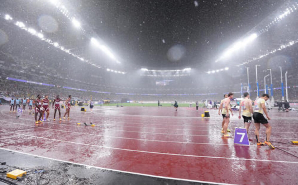 <陸上:世界選手権>◇最終日◇21日◇東京・国立競技場男子の1600メートルリレーを目前にした午後8時15分ごろから国立競技場は豪雨に見舞われた。テレビの画面越しでも雨の激しさが分かるほど。