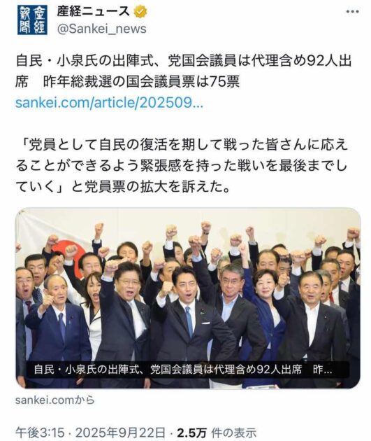 引用元: ・小泉進次郎総裁選出陣式 なんと議員が100人超集まる異常事態(画像あり)wwwwwwwwww [659060378]
