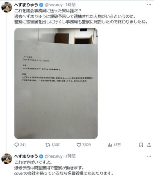 へずま氏は「これを議会事務局に送った奴は誰だ? 過去へずまりゅうに爆破予告して逮捕された人物がいるというのに。警察に被害届を出しに行くし事務局も警察に報告したので終わりましたね」と記述。「へずまりゅうの家爆破する」「へずまりゅう死ね死ね死ね」「お前の家を特定」「絶対にぶち殺す」などと記されているメール文書の写真を掲載した。