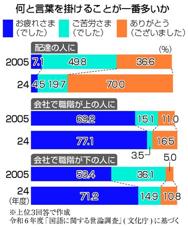 配達時や終業時のねぎらいの言葉として、「ご苦労さま」を使う人が減少していることが26日、文化庁の2024年度「国語に関する世論調査」で分かった。「にやける」や「潮時」といった言葉に、本来とは異なる意味が定着しつつあることも浮かんだ。