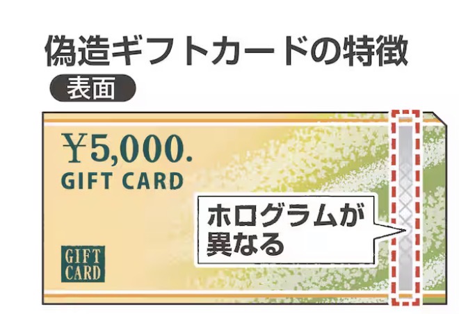 と、ホログラムや紙の質感にも違いがあるというが「一般人では見分けられない」(捜査関係者)という。買い取り店で商品と引き換えたギフトカードが、その後、古物商の元に渡り偽物と判明するケースも確認されている。