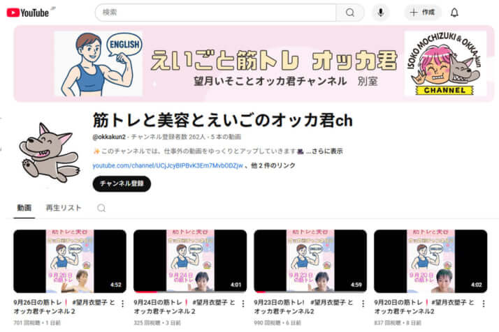 それが9月17日に開設された「筋トレと美容とえいごのオッカ君ch」という名のサブチャンネルである。まずは内容を見ていこう。