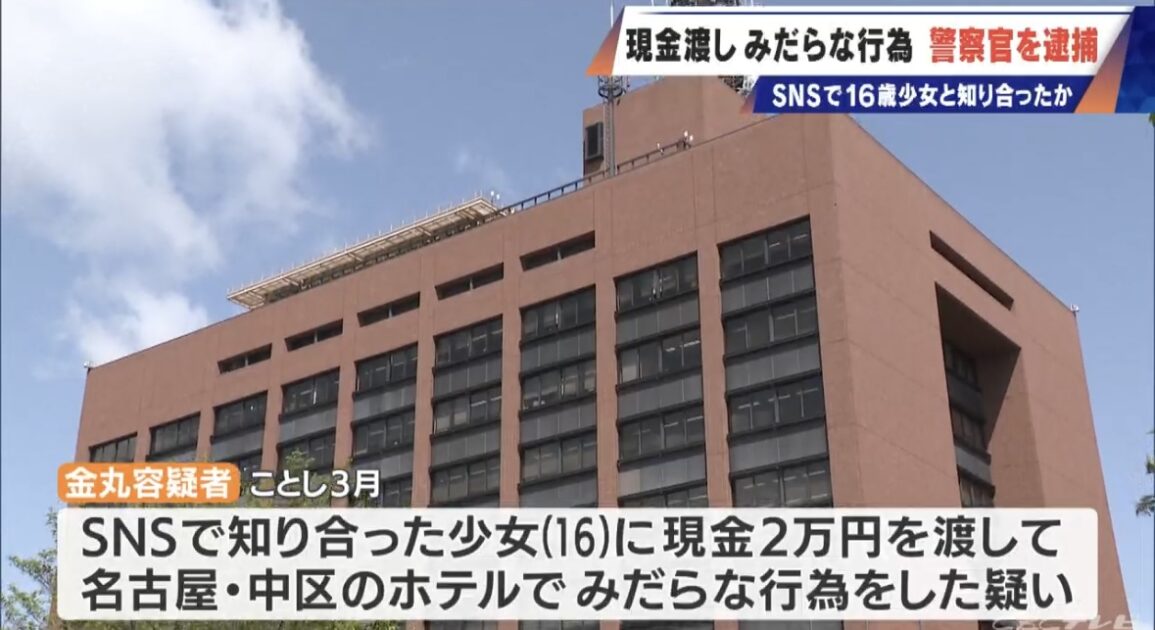 警察によりますと、金丸容疑者はことし3月、SNSで知り合った16歳の少女に現金2万円を渡して、名古屋市中区のホテルでみだらな行為をした疑いがもたれています。