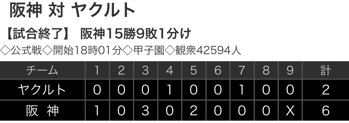 阪神 1 0 3 0 2 0 0 0 x |6 【バッテリー】