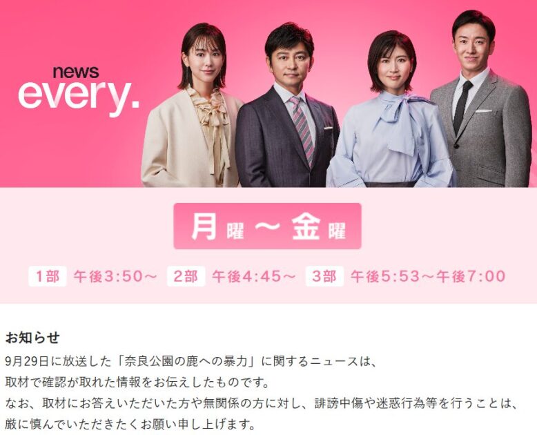 日本テレビは2日、報道番組「news every.」で放送された奈良公園(奈良市)のシカを巡るVTRについて、「取材で確認が取れた情報をお伝えしたもの。