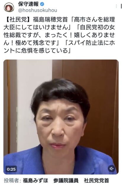引用元: ・福島瑞穂さん、悔しさのあまり声明を出す「自民党初の女性総裁ですが、まったく!嬉しくありません!」 [662593167]