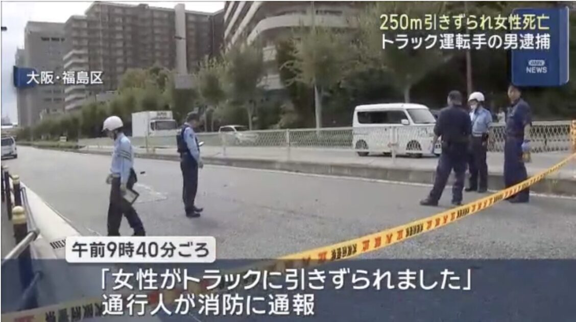 大阪・福島区の交差点で、自転車の女性がトラックと接触し、約250メートル引きずられました。女性は死亡し、警察はトラック運転手の男を逮捕しました。