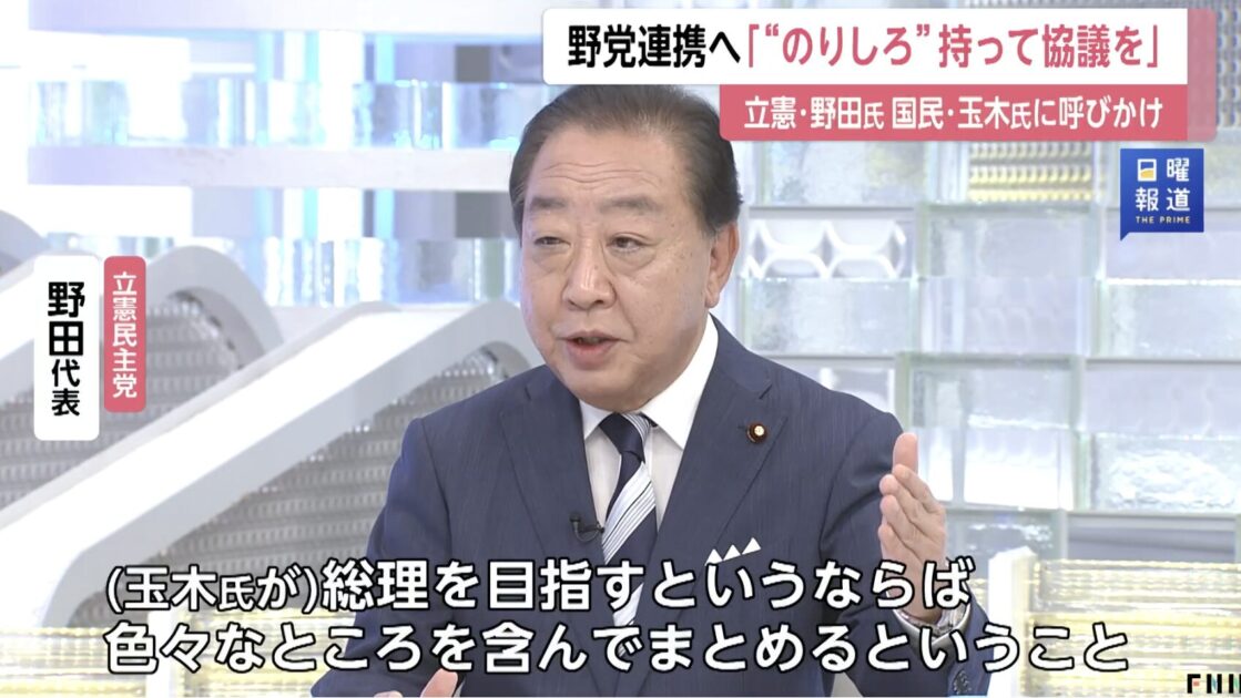 立憲民主党の野田佳彦代表は12日、首相指名選挙で野党候補の一本化をめざすため、国民民主党の玉木雄一郎代表に交渉条件を引き下げるよう求めた。「『のりしろ』を持って協議に応じてほしい」と話した。フジテレビの番組で語った。