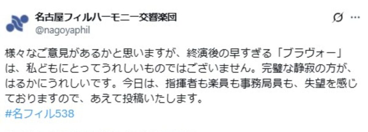 名古屋フィルのXでは「様々なご意見があるかと思いますが、終演後の早すぎる『ブラヴォー』は、私どもにとってうれしいものではございません。完璧な静寂の方が、はるかにうれしいです」と記載。「今日は、指揮者も楽員も事務局員も、失望を感じておりますので、あえて投稿いたします」と意図が示された。同日には定期演奏会が行われる日程だった。
