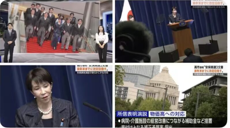 NHKが22日夜の「ニュース7」で高市早苗政権発足を報じた際、斜めに傾いた状態の映像が使用されたことに、SNS上で「意図的で、視聴者を不安視させるためではないか」といぶかる声が上がり、物議をかもしている。NHKは産経新聞の取材に対し、24日、そうした否定的イメージを抱かせた意図はないと回答した。問題視されているのは、ニュース7で、高市首相と新閣僚が赤じゅうたんが敷かれた階段を降りてくる様子や、首相が記者会見に臨み、ズームアップした映像、また「安保関連3文書の改定を来年末までに目指す」政権方針が国会議事堂の映像と合わせて流れたときだ。いずれの場面でも、被写体を正面から水平にとらえるのではなく、被写体が倒れかかっているかのように見える斜めに傾いた映像が流れていた。