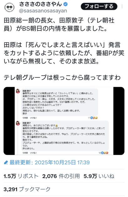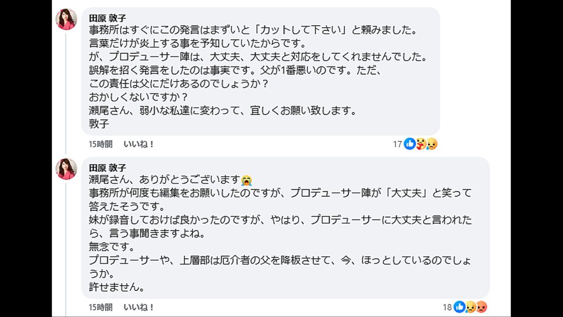 引用元: ・田原氏の長女「死んでしまえ」発言のカットを依頼するも番組Pが笑いながら無視してそのまま放送 [662593167]
