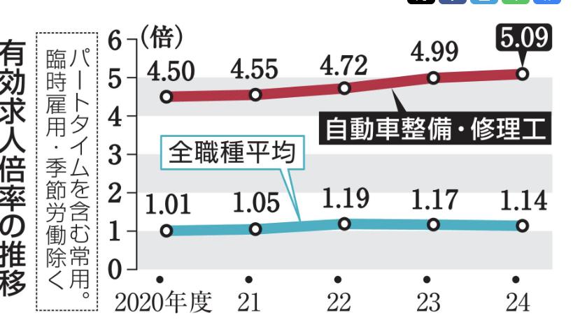 自動車整備・修理工の2024年度の職業別有効求人倍率(パートタイムを含む常用。臨時雇用・季節労働除く)が、前年度比0.10ポイント上昇の5.09倍に達し、全職種平均の1.14倍を大幅に上回ったことが26日、厚生労働省への取材で分かった。5倍を超えるのは、同省が確認できる20年度以降初めて。人手不足は深刻で自動車の安全に影響する懸念もある。 倍率は20年度の4.50倍から毎年上昇している。帝国データバンクによると、自動車整備事業者の24年度の休廃業や解散、倒産は計445件と過去最多だった。慢性的な人手不足が影響した。納期の遅延や受注台数の制限を余儀なくされる事例も目立つという。少子化や若者の車離れに加え、厳しい労働環境と低賃金が人手不足の要因との指摘がある。