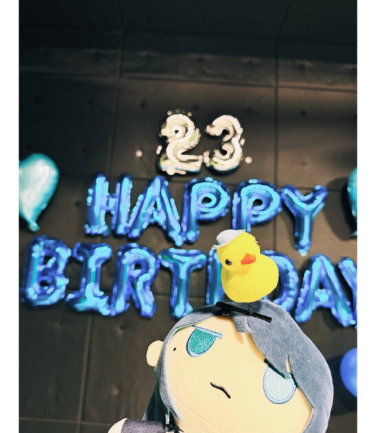 「23 HAPPY BIRTHDAY」の飾り付けをバックに、アヒルを頭に乗せたAdoのぬいぐるみ写真をXに投稿している。
