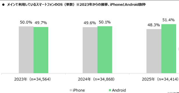 2025年9月のスマホOSのシェア調査で、Androidが51.4%、iPhoneが48.3%となり、Androidが優勢になりました。