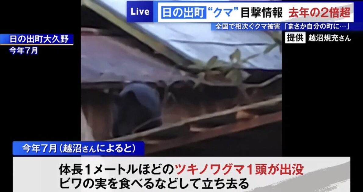 また、実際にクマを自宅近くで目撃したという男性に話を聞くことができました。男性は「ちょうどあの木の1メートルから2メートルぐらい手前で、前からクマが現れた」と証言しました。男性によりますと今年7月の夕方ごろ、体長およそ1メートルのツキノワグマ1頭が現れ、屋根の上でビワの実を食べるなどした末に、その場を離れていったということです。男性は「(クマは)威嚇するというのも全くなかったので、怖いというよりは『本当にまさか、現実ですか』という方が大きかった」と振り返りました。また「ありとあらゆる動物が街の方に出てきている。そういったこともたぶんクマが出てくる一因になっていると思う。そういうことも含めていろいろ考えて対策を取りたいですよね」と話していました。