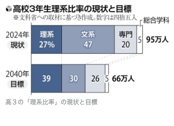 文科省は、40年までに高校の理系比率を39%、文系を30%にする目標を掲げる。卒業後に地域の産業を支えることが期待される工業科や商業科などの専門高校生の割合も、24年の20%から26%に引き上げる。