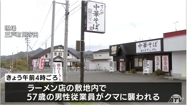 警察や町によりますと、9日午前4時ごろ三戸町川守田のラーメン店の敷地内で、57歳の男性従業員が体長約1mのクマに襲われました。