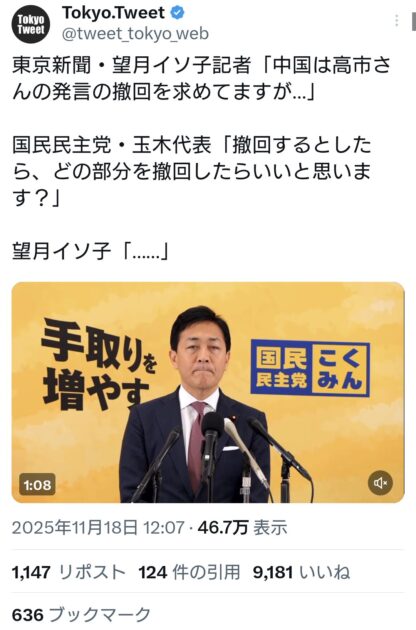 引用元: ・望月記者「中国は高市さんへ発言撤回求めてますが」→玉木氏「どの部分を撤回したら良いと思います?」 [662593167]