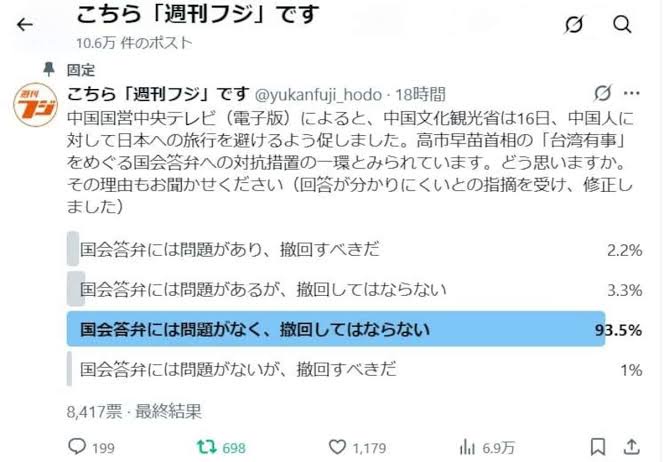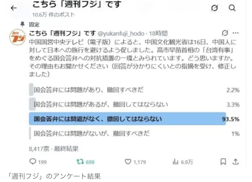 産経ニュースの1コーナー「週刊フジ」のX(旧ツイッター)アカウント「こちら『週刊フジ』です」は17日夕から18時間、高市早苗首相の「台湾有事」をめぐる国会答弁への対抗措置として中国政府が呼びかけたとみられる「日本旅行の自粛」を受け、アンケートを実施した。結果は「国会答弁には問題がなく、撤回してはならない」が圧倒的な93・5%だった。