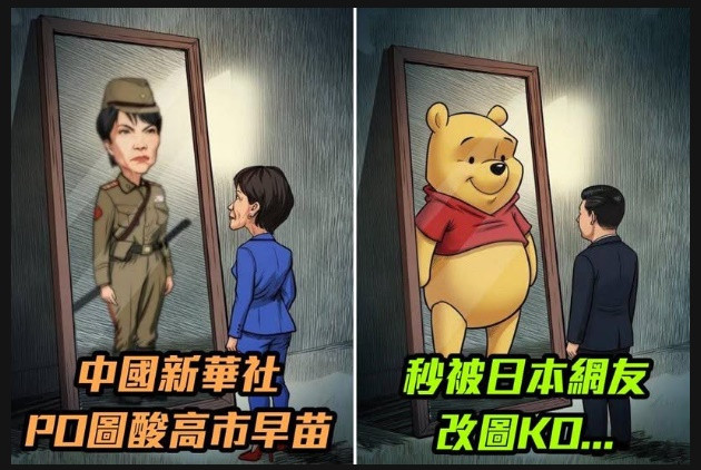高市氏が「軍国主義」へ踏み出しているとの印象を与える内容だが、日本のネットユーザーはすぐさまカウンターを仕掛け、習近平が鏡をのぞくと「くまのプーさん」が映る構図の画像などを投稿して応戦した。