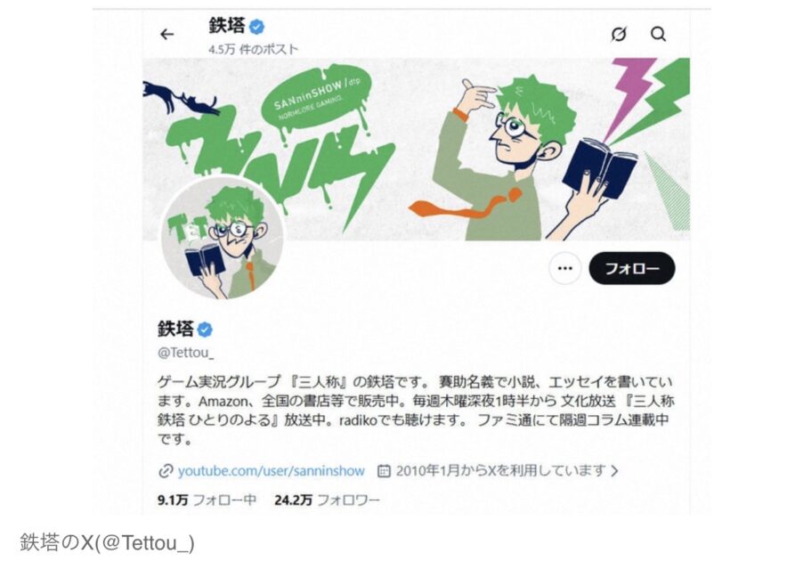 ゲーム実況グループ「三人称」の鉄塔が25日、自身のX(旧ツイッター)を更新。一定期間活動を休止すると発表した。