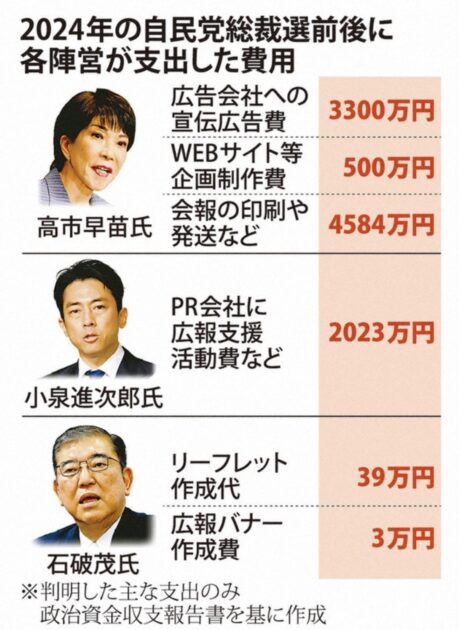 3位だった小泉進次郎防衛相側も、PR会社に約2000万円を支出するなどしており、多額の費用を投じた宣伝合戦が水面下で繰り広げられていた実態が浮かび上がる。