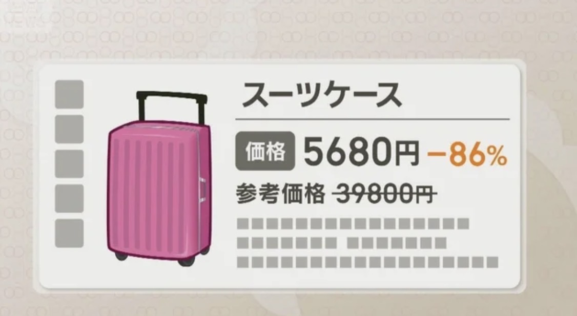 例えば、あるスーツケースはネット通販サイトで参考価格3万9800円から86%引きの5680円で販売されています。