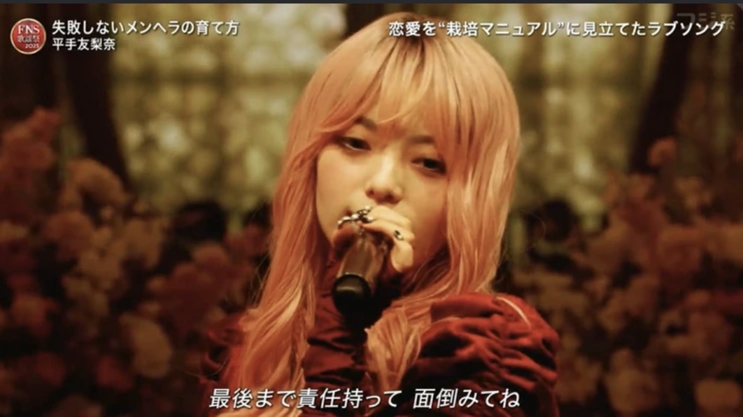 平手は自身の新曲「失敗しないメンヘラの育て方」を、ピンク色のロングヘアに赤いドレス姿で軽快に踊りながら歌唱。