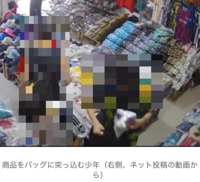 店員とみられる男性が離れると、少年らは、その様子をうかがっている。右側の少年は、Tシャツを手に取ると、いったん戻し、店員の方を見てから、肩掛けバッグの中に素早く突っ込む。少年らは、「11番」などとTシャツにプリントされた番号を確かめ合うかのような会話をしている。