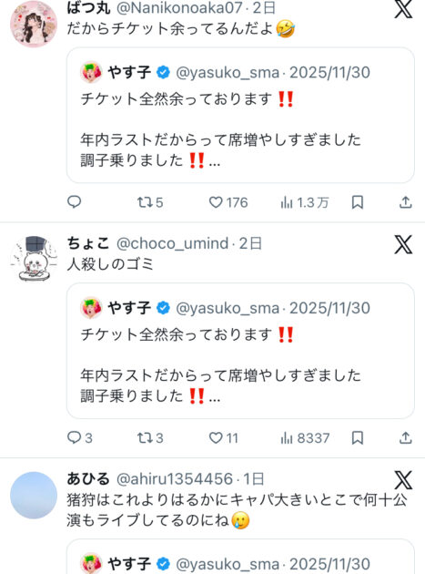 引用元: ・【画像】やすこ「年末の単独ライブのチケットが全然売れません!💦誰か助けて!」←炎上wwwww