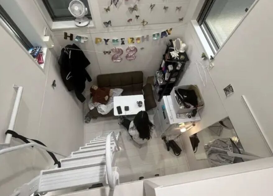 訪問すると、想像以上に狭かった。リビングは3畳ほどで、手を広げれば両側の壁につきそうだ。梯子の上にあるロフトに布団を敷いている。シャワールームとトイレは別々だが、浴槽はない。