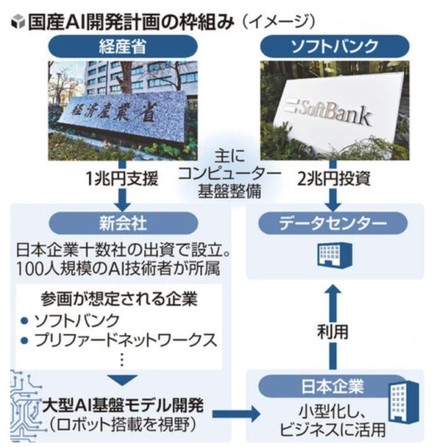 来春にもソフトバンクなどの日本企業十数社が出資して新会社を設立し、国内最大規模のAI基盤モデルの開発を目指す。