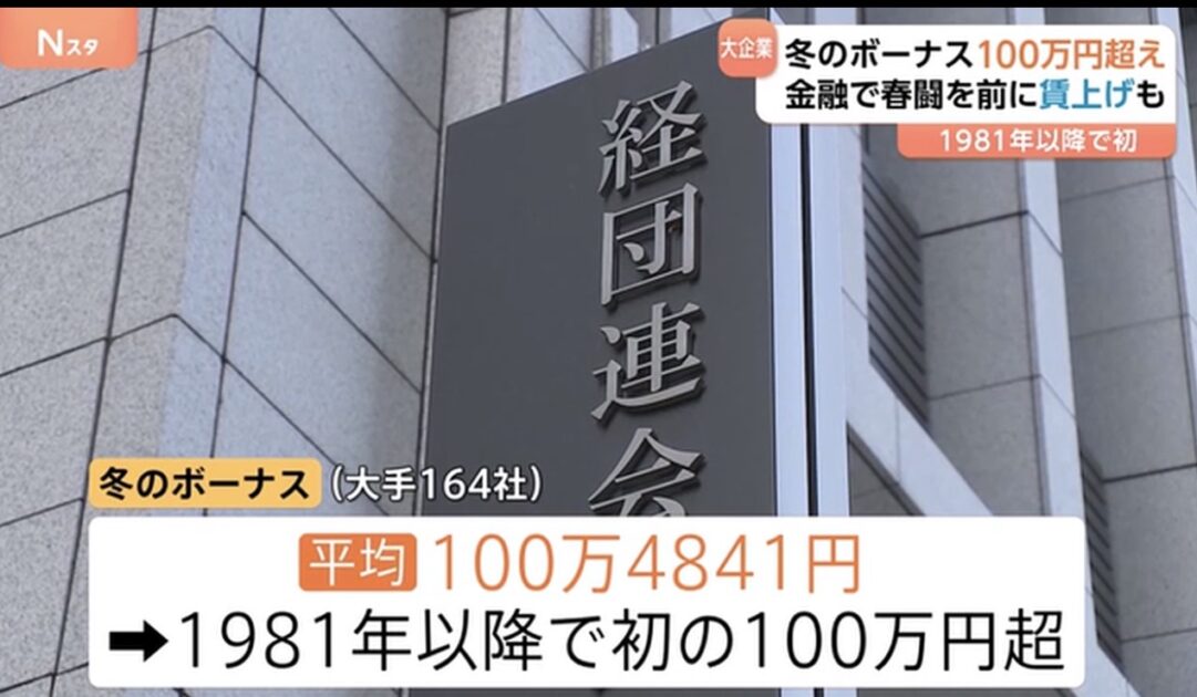 経団連によりますと、大手企業164社の冬のボーナスは平均で100万4841円で、比較可能な1981年以降で初めて100万円を超えました。去年より8.57%増え、増減率は4年連続でプラスとなりました。