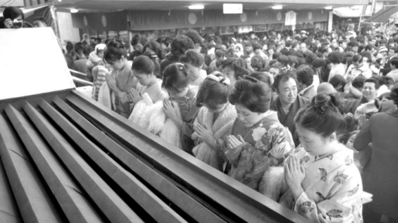 >平成の初めの頃、1990年くらいの神社での初詣の光景が残されているが、それを見ると、かしわ手を打っている人はほとんどいない。大半は合掌している。