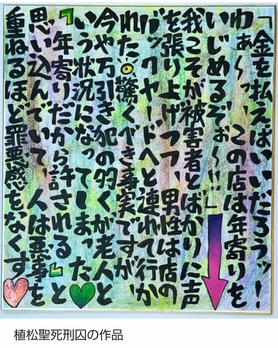 死刑確定者の絵画などを展示する「死刑囚表現展 2025」が12月26日(金)から28日(日)の3日間、東京都文京区の文京区民センター2階会議室で開かれる。16年に相模原市の知的障害者施設「津久井やまゆり園」で入所者ら45人を殺傷した植松聖死刑囚(35)は文字中心の作品に加え、3年ぶりに人物などを描き込んだ絵画を寄せた。宮崎市の自宅で10年、妻子と義母を殺害した奥本章寛死刑囚(37)の作品も6年ぶり。死刑囚の心境をうかがう手掛かりになるかもしれない。
