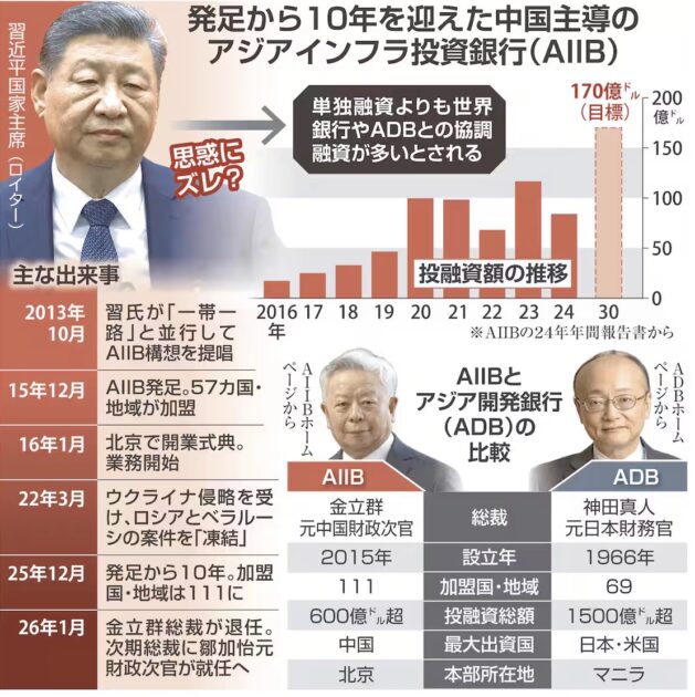 【北京=三塚聖平】中国が主導する国際開発銀行「アジアインフラ投資銀行(AIIB)」が発足してから25日で10年となった。加盟国・地域は創設時の倍近くにまで拡大したが、運営を巡り中国共産党指導部の方針と乖離した動きも見せている。来年1月に予定する初のトップ交代を機に運営方針が変化する可能性がささやかれるほか、中国の金融覇権につながりそうな新たな国際開発銀行の早期設立を習近平国家主席が宣言している。