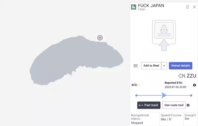 引用元: ・尖閣沖に貨物船「くたばれ日本」が停泊…なりすましか? 船舶情報サイトが非表示へ "F◯◯K JAPAN" [少考さん★]