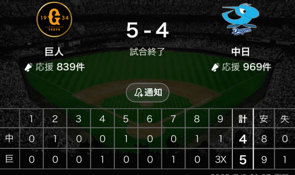1: 鉄チーズ烏 ★ 2025/07/08(火) 21:27:51.78 ID:oEm6Rjh69 中日 0 1 0 0 1 0 0 1 1 |4 巨人 0 0 0 1 0 0 1 0 3x |5 【バッテリー】 (中)金丸、藤嶋、清水 - 石伊 (巨)西舘、石川、船迫、中川、バルドナード -... -
