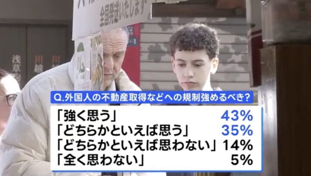 1: 少考さん ★ 2025/07/07(月) 08:56:06.97 ID:NPyJx2m99 ※調査期日:7月5日、6日TBS NEWS DIG https://newsdig.tbs.co.jp/articles/-/2027875 2025年7月6日(日) 23:09 外国人の入国管理や国内での不動産取得などについて、78%の人が「規制を強めるべき」と...