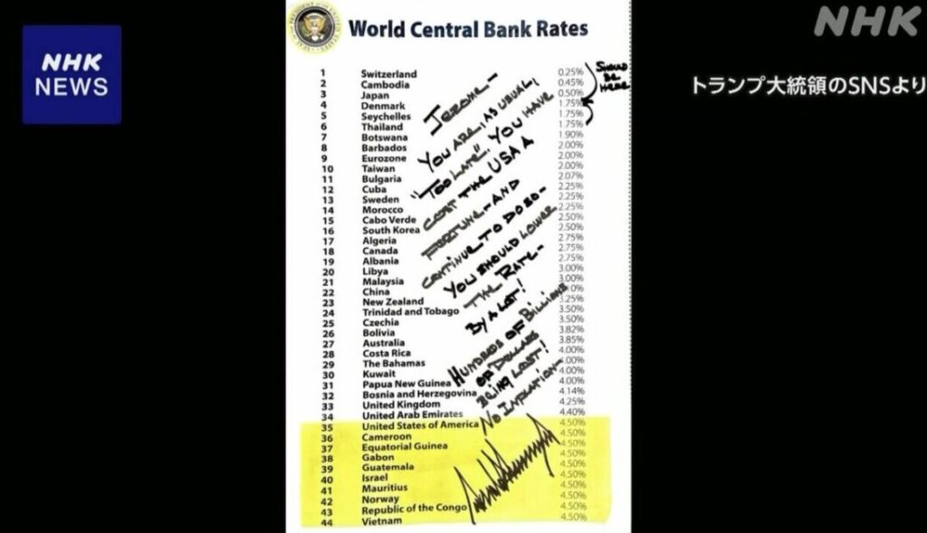 【米国】トランプ大統領 パウエル議長に手書きで「遅すぎる」と書簡