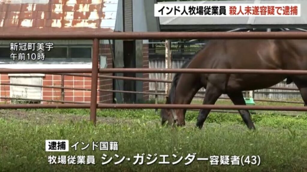 1: シャチ ★ 2025/06/27(金) 12:27:44.55 ID:e9kAZHKf9 北海道日高地方の新冠町の牧場で、インド人の従業員の男が牧場長の男性を鉄パイプで殴って殺害しようとした疑いで逮捕されました。逮捕されたのはインド人の牧場従業員、シン・ガジエンダー容疑者... -