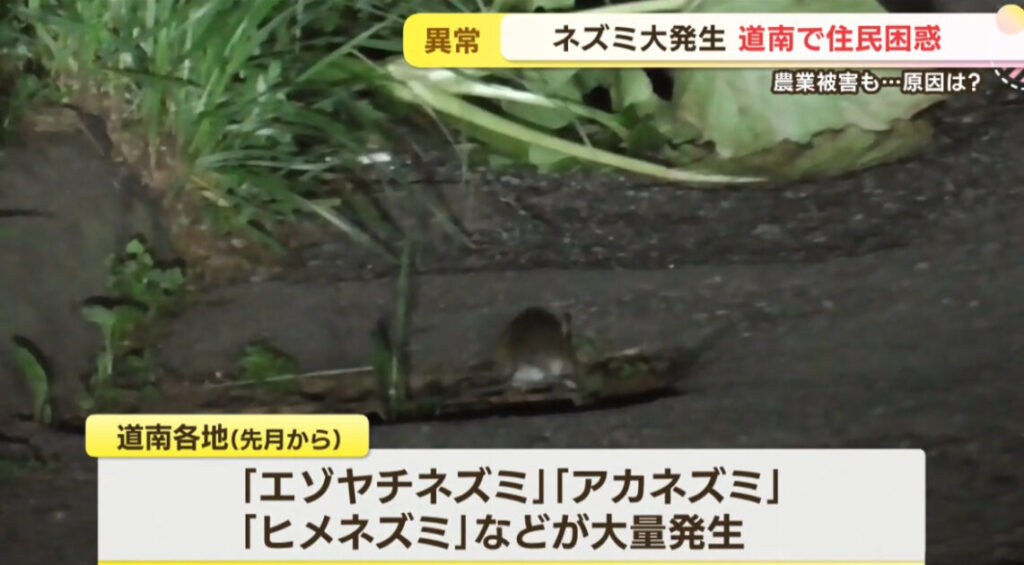 1: すらいむ ★ 2025/06/13(金) 22:00:21.56 ID:qL90saaX ネズミ異常発生!道南の街を席巻…駆除グッズは「爆売れ」 住宅街・農地を脅かす異常事態に記者も悲鳴 北海道南部の各地でネズミが大量発生していて、幹線道路や住宅街にも出没する事態となっていま... -