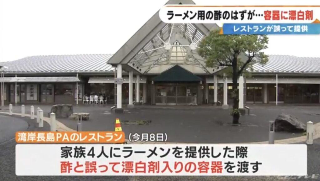 1: シャチ ★ 2025/06/11(水) 19:20:10.77 ID:0utSWdMq9 高速道路のサービスエリアのレストランが、ラーメンの酢と間違えて「漂白剤」をお客さんに出し、小学生と母親の2人がのどに軽いけがをしました。(中道陸平記者) 「酢と誤って漂白剤が提供されたレ... -