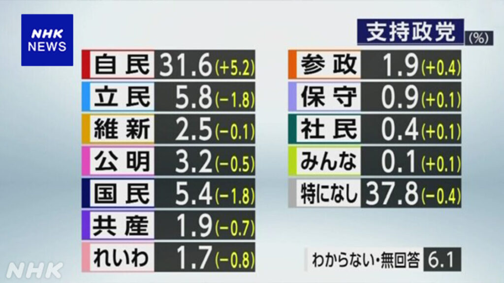 1: 少考さん ★ 2025/06/09(月) 20:04:59.07 ID:yT9x4RC49 ※調査期間:6月6日~8日 NHK https://www3.nhk.or.jp/news/html/20250609/k10014829781000.html 2025年6月9日 19時27分 6月の各党の支持率です。 「自民党」が31.6%、「立憲民主党」が5.8%、「日... -