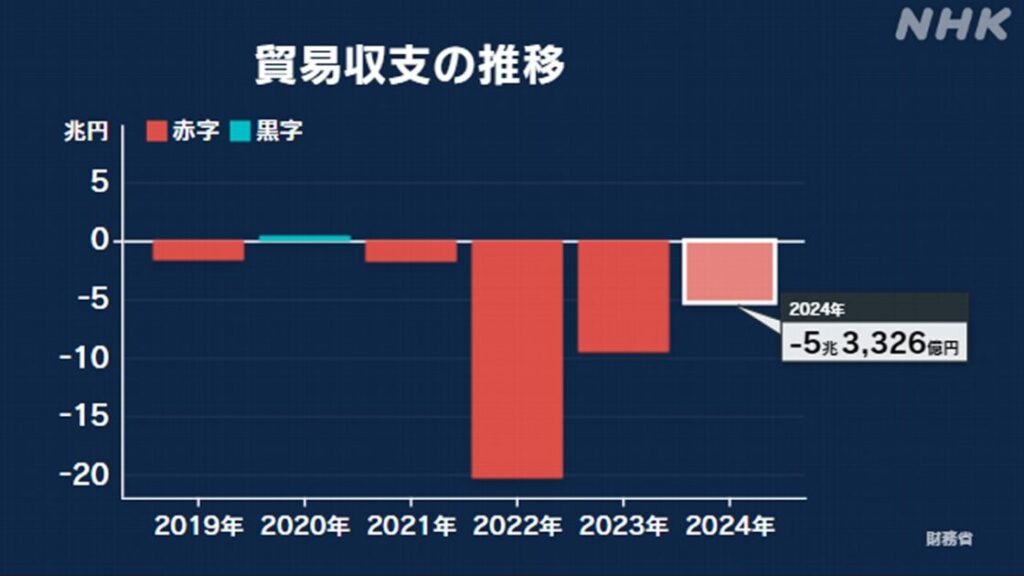 1: 少考さん ★ 2025/01/23(木) 09:31:16.42 ID:4z8N+2Kf9 去年の貿易収支 4年連続の赤字 5兆3326億円 12月は6か月ぶりの黒字 | NHK | 貿易統計 https://www3.nhk.or.jp/news/html/20250123/k10014700911000.html 2025年1月23日 9時19分 財務省が発表した、... -